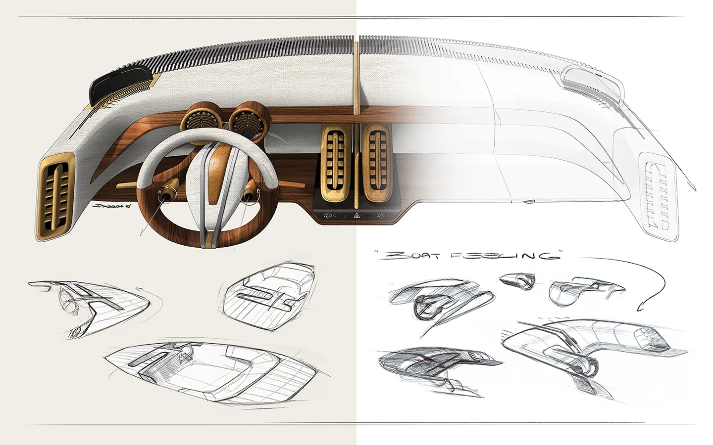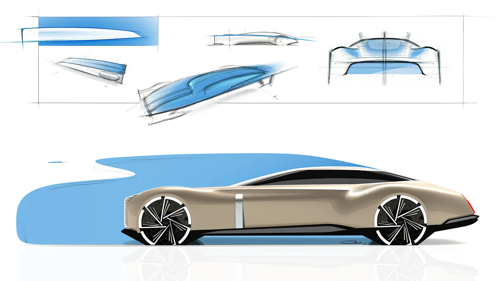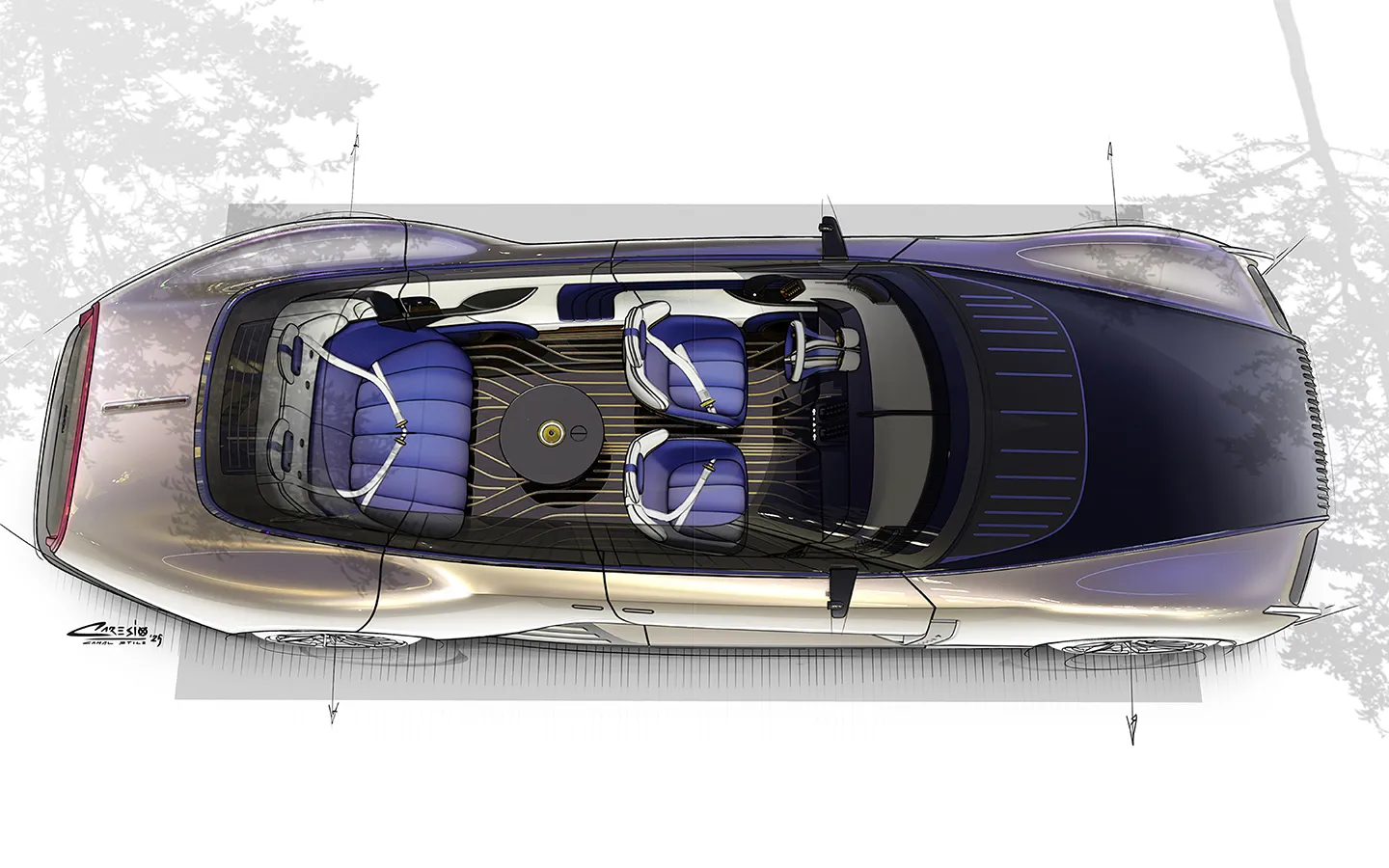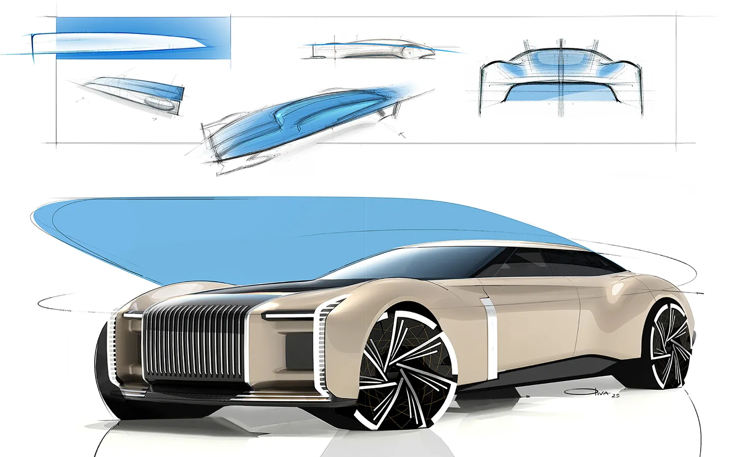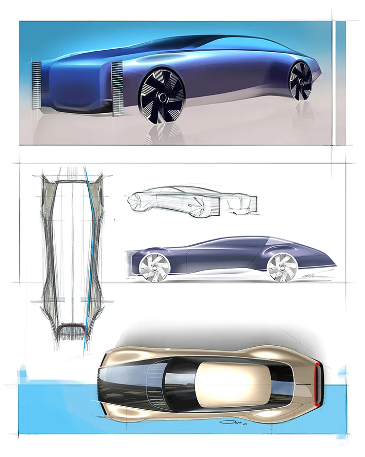 Long bonnet, rearward cabin and boat-tail rear inspired by nautical forms and vintage grand tourers. The vertical, monumental front grille recalls Art Deco architectural patterns; the windows interact with the idea of continuous, “urban” surfaces.
