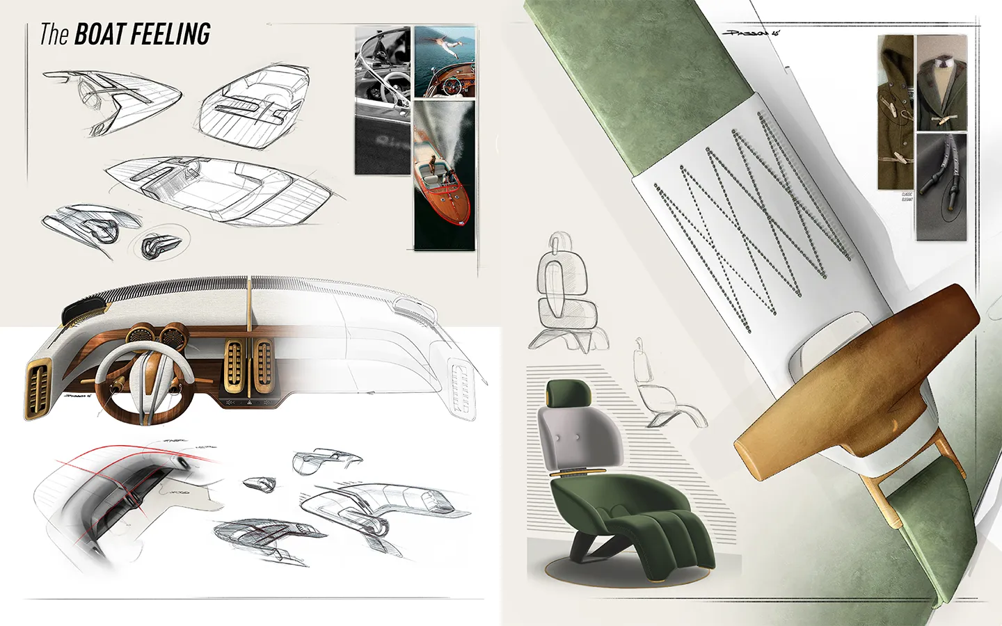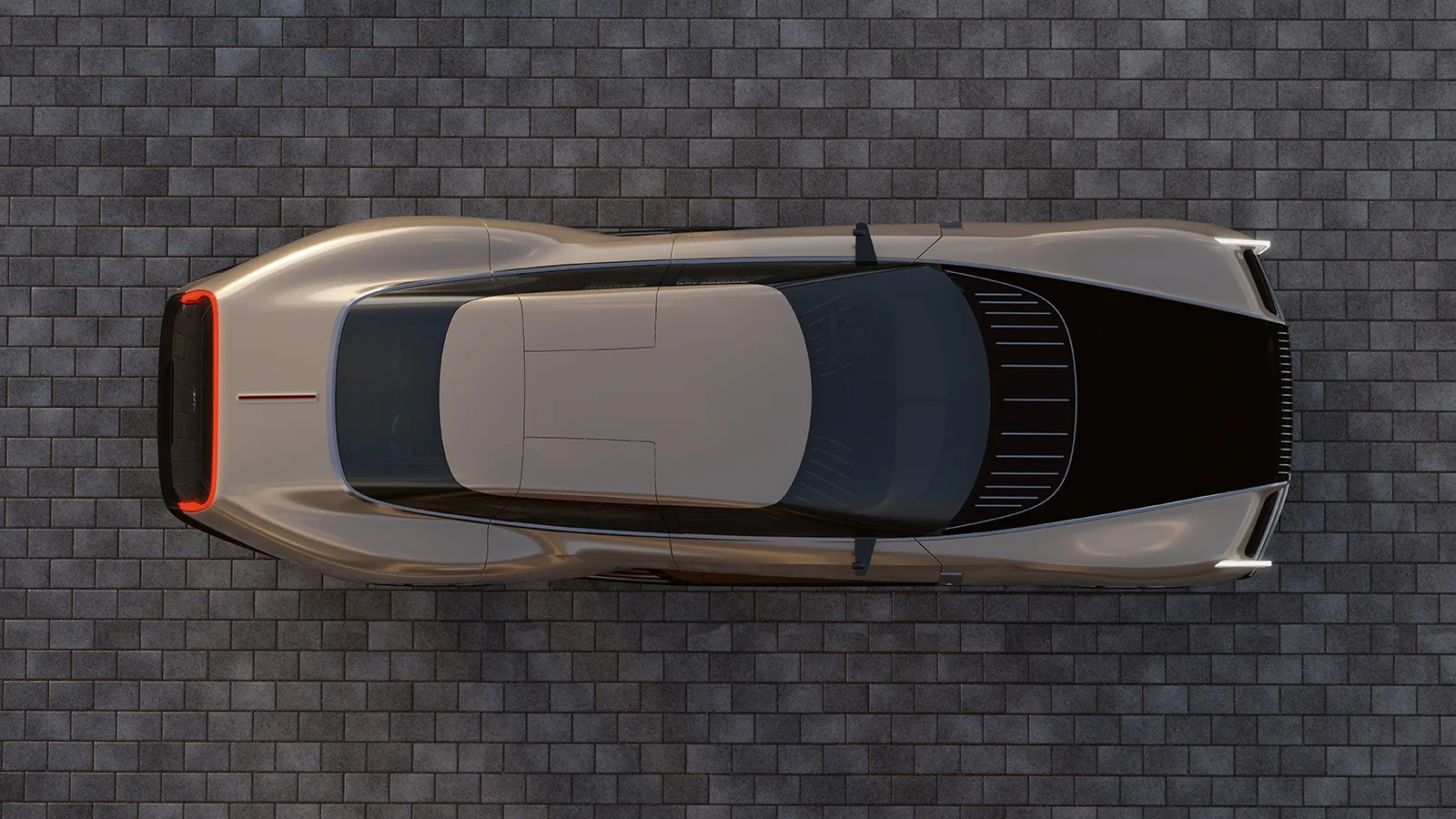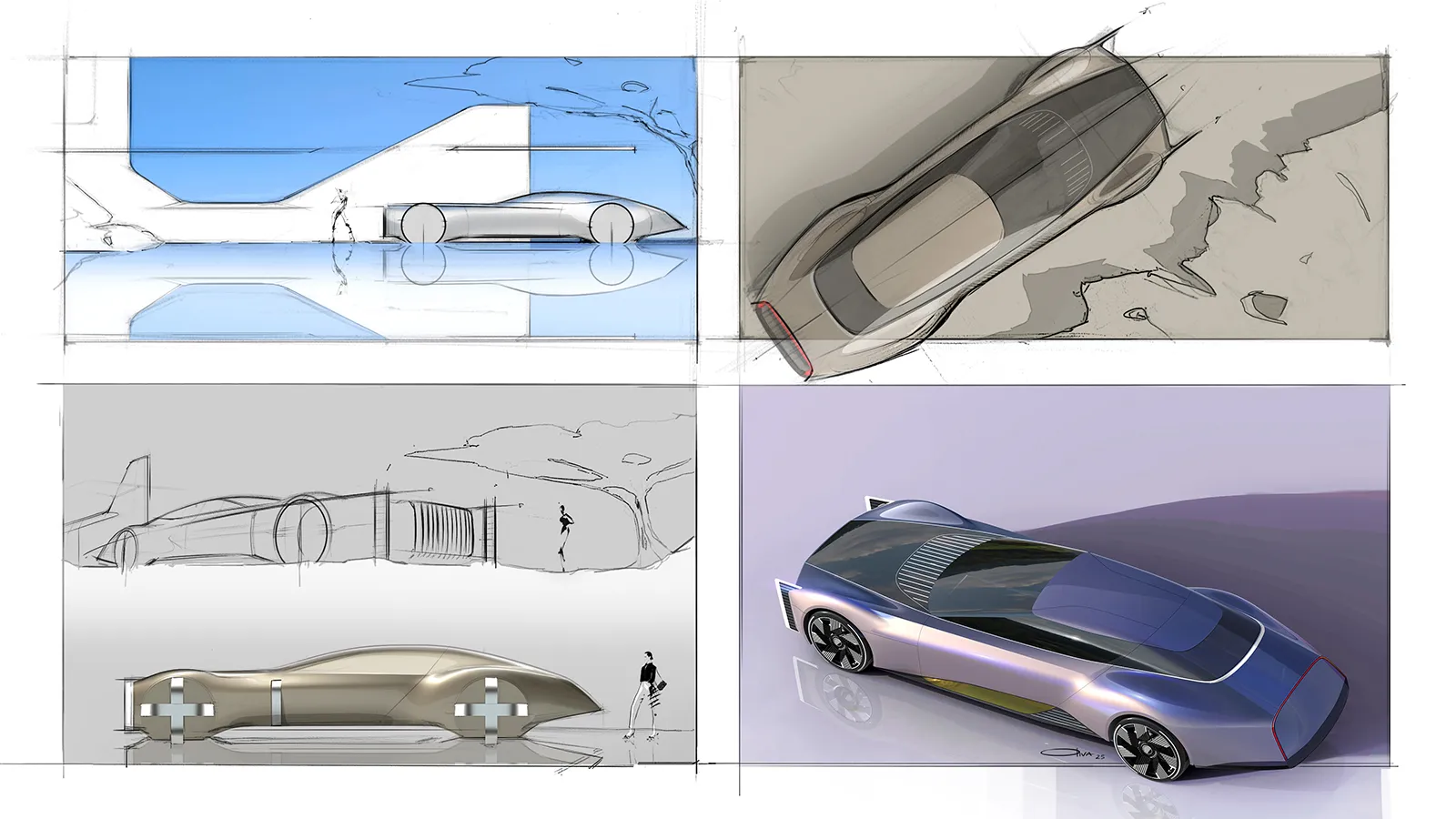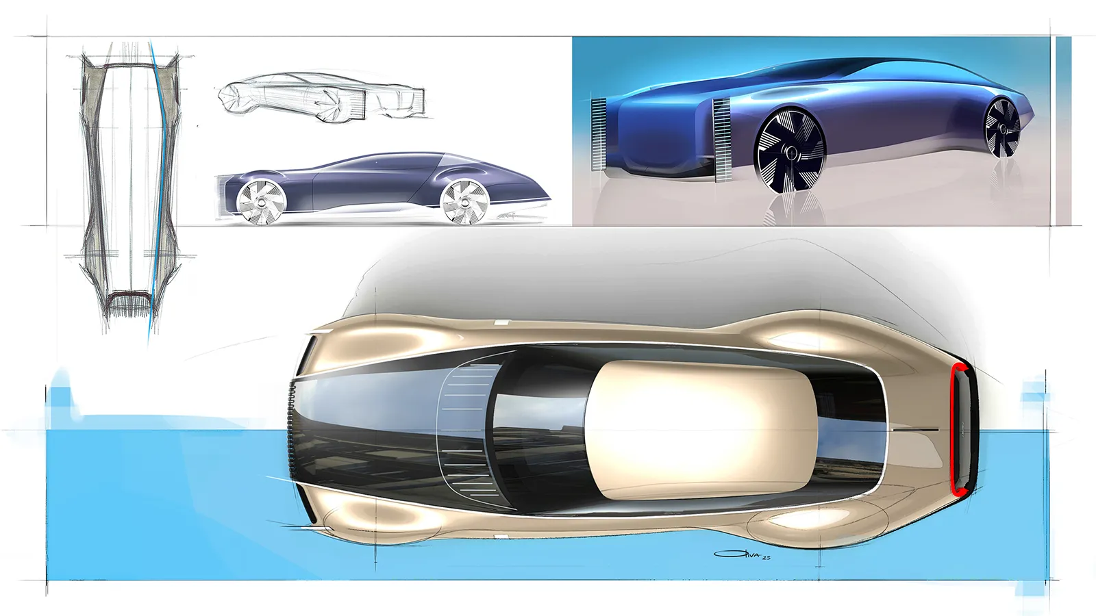 Long bonnet, rearward cabin and boat-tail rear inspired by nautical forms and vintage grand tourers. The vertical, monumental front grille recalls Art Deco architectural patterns; the windows interact with the idea of continuous, “urban” surfaces.