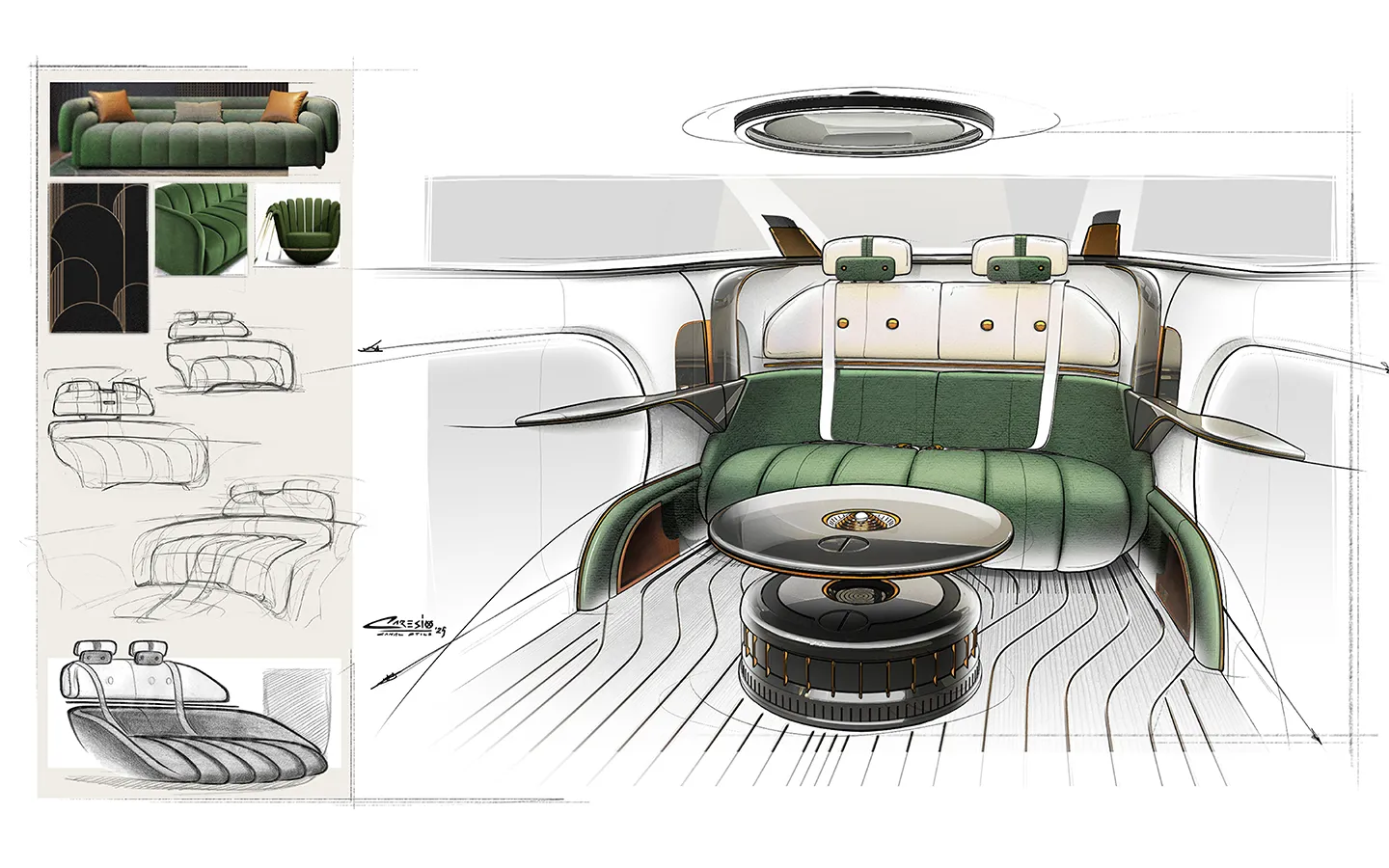 Inside, the experience is governed by an artificial intelligence-based assistant that coordinates the entire on-board ecosystem through natural voice commands. The adaptive microclimate adjusts temperature, humidity and fragrance according to the guest’s profile, and the same applies to light, sound and atmosphere. The result is a cabin in which the use of physical interfaces and controls is minimised, because the voice becomes the centre of control.