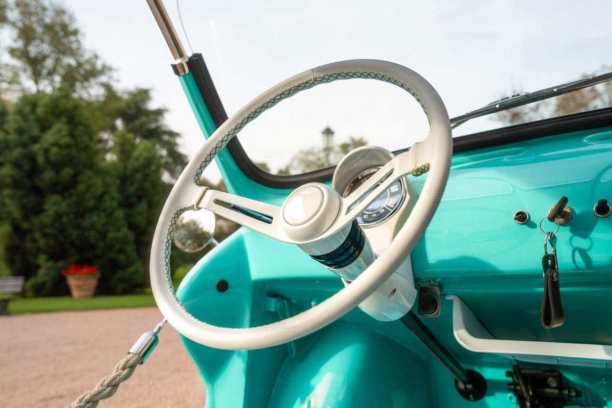 Converted to 100% electric, the 500 Spiaggina E-Classic has been fully restored by Aznom Automotive in its mechanical parts and in every detail, both exterior and interior, including the use of fine materials.