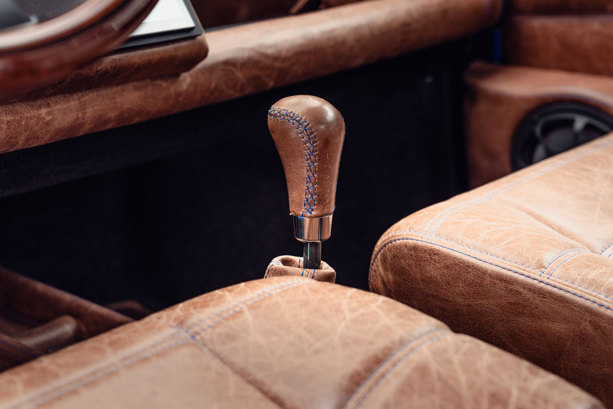 Gli interni combinano lusso e tradizione, presentando rivestimenti in pelle Aged Saddle Brown, dettagli blu coordinati e un volante Nardi.